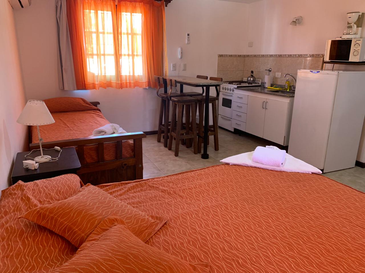 Departamento de un ambiente amplio. Cuenta con sommier matrimonial, cama de una plaza, cocina completa, utensillos, microondas, heladera con freezer, baño completo y caja de seguridad.