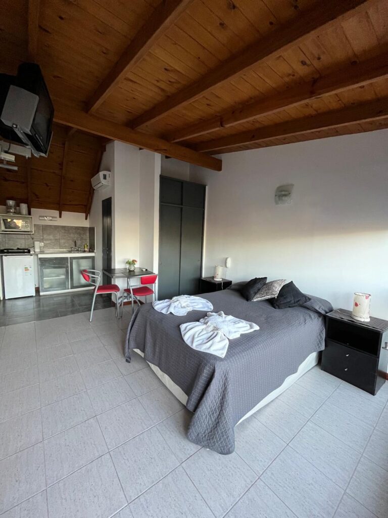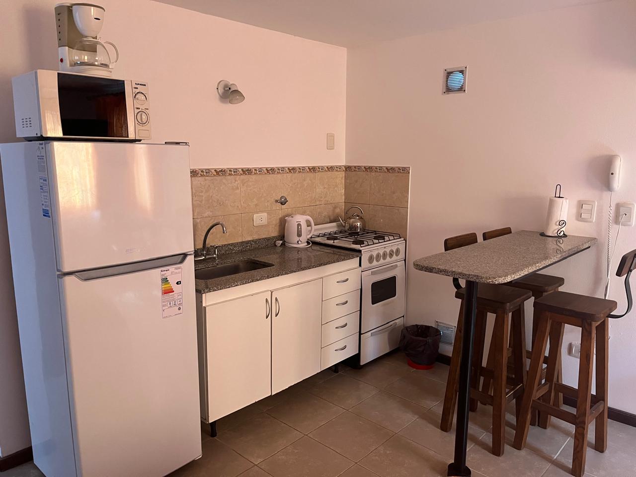 Departamento de un ambiente. Cuenta con sommier matrimonial, anafe electrico, microondas, utensillos de cocina, heladera, TV, aire acondicionado, baño completo y caja de seguridad.